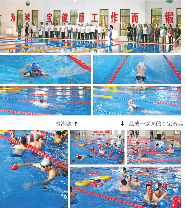 熱身賽后,全體人員集合后,列隊(duì)行進(jìn)到比賽場(chǎng)地桂苑泳館,準(zhǔn)備進(jìn)行下午的比賽。下午的比賽項(xiàng)目為300米個(gè)人游泳、4X60米游泳接力賽及水上趣味賽奪寶奇兵。參賽運(yùn)動(dòng)員換上比賽泳裝后各就各位,隨著哨聲想起,比賽正式開始。無論是個(gè)人比賽還是團(tuán)體比賽,各參賽隊(duì)員懷著“會(huì)當(dāng)擊水三千里”的豪情,各個(gè)精神飽滿,奮力拼搏,只見大家你追我趕,互不相讓,自由泳劈波斬浪,蛙泳優(yōu)美矯健,泳池里浪花翻騰、人影起伏,引來現(xiàn)場(chǎng)喝彩聲一片,氣氛相當(dāng)活躍。各團(tuán)隊(duì)選手團(tuán)結(jié)協(xié)作,互相配合,拉拉隊(duì)員們加油鼓勁助威聲給選手們?cè)鎏砹藙?dòng)力與激情,游泳館內(nèi)頓時(shí)熱鬧非凡,激烈的比賽真正體現(xiàn)了力量與速度的比拼,幾輪比賽下來,團(tuán)隊(duì)的比分逐漸拉開。