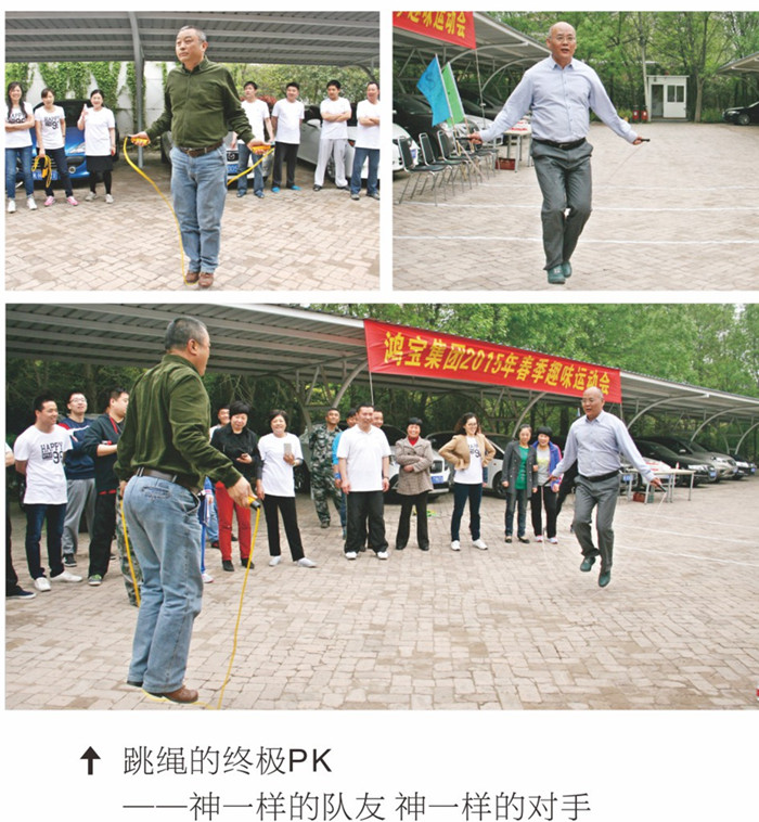 當(dāng)天的比賽項(xiàng)目為個(gè)人跳繩、集體跳大繩、拔河比賽,各隊(duì)隊(duì)長(zhǎng)帶領(lǐng)團(tuán)隊(duì)投入了比拼。跳繩是充滿活力的運(yùn)動(dòng),在精力充沛的鴻寶人的熱情參與下,顯得更加活蹦亂跳、生機(jī)勃勃、斗志昂揚(yáng)。“一、二、三……”為了集體的榮譽(yù),齊心協(xié)力,運(yùn)動(dòng)員們使出渾身解數(shù),跳繩被甩得飛快,不時(shí)被跳繩絆住,但立即又調(diào)整……個(gè)人跳繩后,集體跳大繩比賽開賽啦!跳大繩最考驗(yàn)的是團(tuán)隊(duì)的配合,任何一個(gè)隊(duì)員的失誤都會(huì)影響整個(gè)團(tuán)隊(duì)。只見大繩有節(jié)奏、有韻律地凌空搖著,參賽隊(duì)員們協(xié)調(diào)一致、輕盈地跳進(jìn)跳出,圓滿地完成了各隊(duì)的任務(wù)。